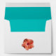 This bright white linen envelope with accents of turquoise and orange, has a coral hibiscus on the back of it to coordinate with the wedding invitation and other items shown below. Customise it to have your own return address on it.