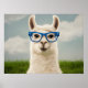 White Llama with Blue Glasses – Cute and Trendy Animal Photo. Adorable white llama sporting stylish blue glasses. This charming image captures the llama's playful personality and unique look.