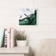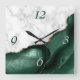 Elegant modern white marble and emerald green agate trimmed with faux gold glitter combine in this luxurious square wall clock. The numbers 3 and 6 appear in light grey on the blue agate background, while the numbers 9 and 12 appear in green on the white marble.