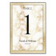 A white marble with gold veins and gold border wedding table number card that can be customised with any table number. The graphics appear on both sides of this card.