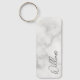 This design features personalised name in grey modern handwriting script font on white marble background.