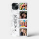 Create your own personalized 4 photo collage phone case with your custom images and name on a stylish elegant white marble background.