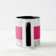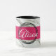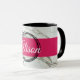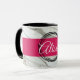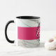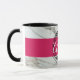 Modern white marble background, pink and black hand drawn circles mug. Trendy geometric round name logo on fuchsia and marble mug.