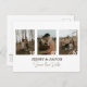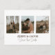 Announce your special day with this modern minimalist save the date design featuring an elegant photo collage layout. Showcasing personal couple engagement photos in a three photo wedding collage framed in white, this stylish wedding announcement card blends a rustic botanical wedding theme with botanical accent save the date details. The clean soft script typography complements the minimalist neutral colour palette, and the easy to mail postcard style makes this a perfect choice for couples seeking a simple, elegant, and personal invitation.