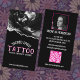 Features white modern and pink decorative text for business name, services offered and website with image on the front. White modern text for your name, phone number, address and personal contacts with QR code and personal photo on the back, all on a black background color. Perfect for tattooists or other small business owners.