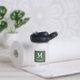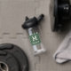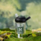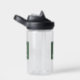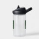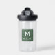 Small water bottle with white name and monogram on a green rounded square, on both front and back.