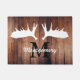 Deep, rich, rustic brown wooden barn planks with a crisp white moose antlers silhouette and your personalised family name and monogram letter.