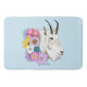 A side profile portrait of a white mountain goat. Wild flowers are all around the mountain goat all drawn in a tattoo style in a backdrop of blue