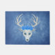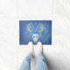 This outdoor welcome door mat is a misty mix of blues with a mythical white deer head with big antlers and wearing three pretty blue roses.