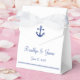 White nautical wedding favour boxes (tent favour box with white ribbon) with anchor and customisable text - you can add bride's and groom's name and wedding date.