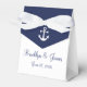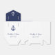 White and navy blue nautical wedding favour boxes (tent favour box with white ribbon) with anchor and customisable text - you can add bride's and groom's name and wedding date.