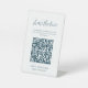 White and navy share the love QR Code pedestal sign. Place these signs at your wedding reception tables so guests can scan to upload the photos they took at your wedding reception to your album or social media. To generate a new QR code on the design, add the URL of your online wedding album or social media handle in the area provided, using the "personalise" feature. A brand new QR code will then be added to to the design.