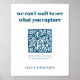 White and navy blue wedding photo share QR Code sign. Place these signs at your wedding reception tables so guests can scan to upload the photos they took at your wedding reception to your album or social media. To generate a new QR code on the design, add the URL of your online wedding album or social media handle in the area provided, using the "personalise" feature. A brand new QR code will then be added to to the design.