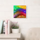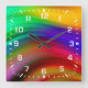 Clock with a white square clock face on a background with rainbow wave stripes in purple, blue, green, red, pink, and yellow. Customisable. Modern and trendy, yet classic, this clock is perfect for any decor.