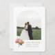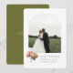 Modern and chic. This lovely wedding save the date card features a beautiful bouquet of voluptuous roses against white and olive green backgrounds. The design includes a couple photo in boho arch frame, contemporary set of fonts in olive green at the front and additional optional text at the back.