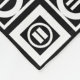 Bold geometric pattern features four white squares with space between them on a black background. The diagonally opposed thick squares each contain a thin white circle with a thick equal sign inside. In contrast, the thin squares each contain a thick white circle that touches the square’s edges with a thin vertical equal sign inside.