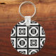 Bold geometric pattern features four white squares with space between them on a black background. The diagonally opposed thick squares each contain a thin white circle with a thick equal sign inside. In contrast, the thin squares each contain a thick white circle that touches the square’s edges with a thin vertical equal sign inside.
