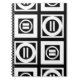 Bold geometric pattern features four white squares with space between them on a black background. The diagonally opposed thick squares each contain a thin white circle with a thick equal sign inside. In contrast, the thin squares each contain a thick white circle that touches the square’s edges with a thin vertical equal sign inside.