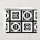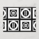 Bold geometric pattern features four white squares with space between them on a black background. The diagonally opposed thick squares each contain a thin white circle with a thick equal sign inside. In contrast, the thin squares each contain a thick white circle that touches the square’s edges with a thin vertical equal sign inside.