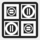 Bold geometric pattern features four white squares with space between them on a black background. The diagonally opposed thick squares each contain a thin white circle with a thick equal sign inside. In contrast, the thin squares each contain a thick white circle that touches the square’s edges with a thin vertical equal sign inside.