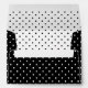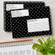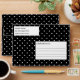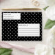 Destei's white polka dots pattern on a black background color. There are two personalizable text areas on white backgrounds as well. One is for the return address and the other is for custom title for the mailing header.