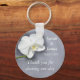 White Orchid flower on soft shaded silver background wedding favour key ring. Easy to personalise, just write your personal details. Orchids make for a auspicious symbol for weddings as their meanings are love, beauty strength and luxury.