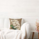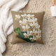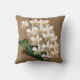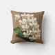 Throw pillow in a vintage botanical print of white phalaenopsis, or moth orchids growing wild, on a light coffee tan background, digitally enhanced