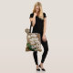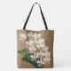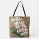Printed tote bag in a vintage botanical print of white phalaenopsis, or moth orchids growing wild, on a light coffee tan background, digitally enhanced