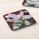 Protect your table top from water marks and stains with this set of 6, glossy beverage coasters featuring the colourful photo image of the backside view of a white Oriental Lily bloom against the blurred background of a Burning Bush shrub. A lovely, floral design!