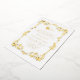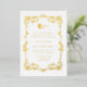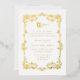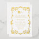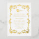 Ornate gold foil wedding invitation done in white with gold rose vines framing the text area and a single long stem rose at the top of the text area. Personalise the foil text to suit your wedding needs.