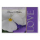 White pansy with dark yellow centre and love in silver font.