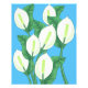White peace lily illustration on pale blue background. Floral design. Peace lilies (Spathiphyllum), are evergreen herbaceous perennial plants with large leaves. The beauty of peace lilies bring calmness by alleviating feelings of stress in the mind and body. Peace Lily can be associated with peace, innocence, purity, healing, hope, prosperity and chastity. It is often gifted as a sign of sympathy, longevity, beauty, rebirth or virtue. Flower lover gift.
