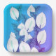 White Peace lily on light blue to purple background. Illustrated floral design.