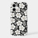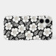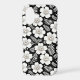 Large white flowers with pearl centers contrast beautifully against a black background, surrounded by intricate fern-like leaves