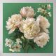 Elegant romantic gentle white peonies with spring flowers and foliage on green background.
