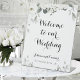 A subtle white Welcome To Our Wedding tabletop sign featuring a delicately painted watercolor of white peony florals and eucalyptus greenery along the top and bottom, with a black handwritten script in a swashed calligraphy welcoming guests to your wedding.