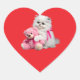 A white Persian kitten is hugging a pink Teddy bear on a heart-shaped sticker.