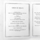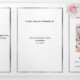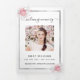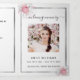 An elegant tri-fold program. A white background, a faux silver frame, pink and white florals and space for a photo. Personalise and add name, dates and your text.