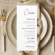 Minimalist white menu with a custom script guest name, designed to serve as both a place card and dining guide. Perfect for weddings, rehearsal dinners, bridal showers, or engagement parties, this versatile card combines personalisation with modern elegance. The black-and-white layout and chic typography create a timeless, stylish detail that enhances table settings for any sophisticated celebration.