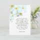 White plumeria wedding invitations with big flowers in the upper corner. Customise the black text which is slightly off-centre, line by line. Full names of the bride and groom are connected by an "and" sign (ampersand). White flowers have golden yellow centres. Reverse is solid yellow-green colour.