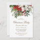 Elegant botanical Christmas party invitation featuring white poinsettia, holly with red berries and other greenery.