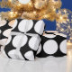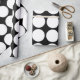 Bold white polka dots on a black background form a distinctive geometric pattern.