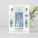 Announce your new address with our stylish announcement featuring a white poodle, blue front door, welcome mat, slate sign, topiaries and a floral wreath set on a grey brick background.