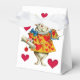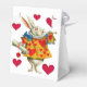 White tent-style favour box with white ribbon with a vintage Alice in Wonderland image, on the front and back, of the White Rabbit in full regalia amid whimsical red hearts. Try changing the ribbon to red or blue for contrast. See the entire Wonderland Favour Box collection in the PARTY FAVORS section.