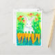 A pretty post card for Easter or any day to say hello featuring a white rabbit in a garden with bright orange carrots and wildflowers painted in colourful shades of watercolor.
