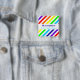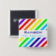A rainbow and white stripes pattern with space for a custom name and pronouns.