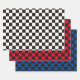 Black and white chequered wrapping paper sheet, a black and red chequered wrapping paper sheet and a black and blue chequered wrapping paper sheet.