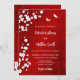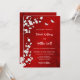 White cherry blossom branches and two butterflies with a red shimmering background. Japanese style wedding invitation.