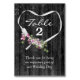 White ribbon heart with bow, pink flowers, and green ivy on rustic dark grey barn wood for table number.