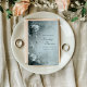 Invite your guests into a world of timeless elegance and pristine romance with this exquisite wedding invitation. The design features a stunning, soft monochromatic dusty gray backdrop, enveloped in a dreamlike, atmospheric mist or soft fog that gives the scene an ethereal quality. The borders are beautifully composed of intricate botanical elements, dominated by velvety white roses and delicate filler flowers like baby's breath, along with small daisy-like blooms. The foliage is rendered in cool, muted deep slate blue and dusty sage tones, giving the entire composition a frosted, cool-weather aesthetic. The soft, diffused lighting and rich floral detail ensure this card beautifully sets the stage for a classic, sophisticated celebration. This invitation card is ideally suited for a winter wedding ceremony, a high-end bridal luncheon, or a serene vow renewal ceremony. It would also perfectly suit a formal engagement announcement or a sophisticated seasonal holiday party. The card's captivating blend of pristine florals and a moody, monochromatic backdrop ensures it is versatile for any solemn ceremony, corporate gala, or refined birthday announcement.